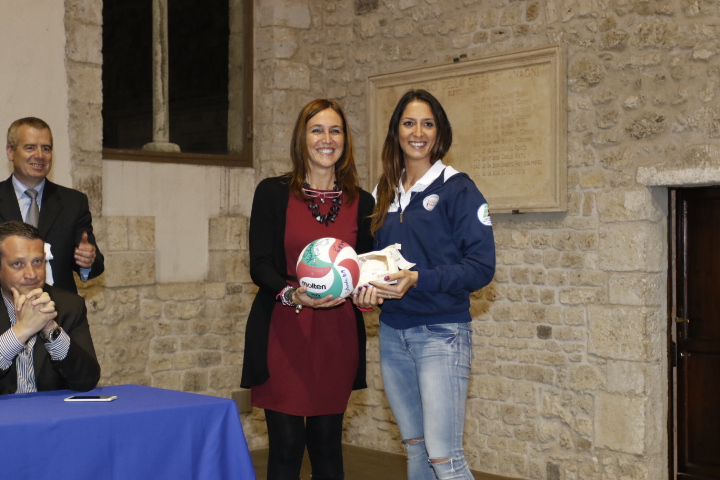 Di fronte alle maggiori autorità cittadine e regionali le giocatrici hanno salutato la cittadinanza e hanno donato la maglia da gioco al sindaco Fausto Bassetta e il pallone ufficiale all'assessore allo sport Alessandra Cecilia. La cerimonia s'è aperta con un momento di raccoglimento dedicato alla memoria delle vittime degli attentati terroristici di Parigi. “Siamo felici di poter ospitare l'Omia Volley ad Anagni e come sindaco esprimo grande gioia con la consapevolezza che la città saprà apprezzare l'impegno delle giocatrici in campo sostenendole nel migliore dei modi” queste le parole del primo cittadino di Anagni a cui hanno fatto seguito quelle dell'assessore allo sport che ha aggiunto “si tratta di un'occasione importante e anche una grande risorsa per il territorio”. Il consigliere provinciale con delega allo sport Domenico Alfieri ha portato i saluti della Provincia di Frosinone e la testimonianza di vicinanza del Comune di Paliano di cui è sindaco, mentre il presidente regionale del Coni Riccardo Viola ha sottolineato l'importanza di questa avventura sportiva. “Sono estremamente felice che l'Omia Volley sia riuscita a unire idealmente grazie alla pallavolo le province di Latina e di Frosinone, allo stesso tempo auspico che il mondo dello sport e quello della scuola possano collaborare in futuro creando sinergie volte all'aumento della pratica sportiva” ha spiegato il presidente Viola che poi ha salutato anche il delegato provinciale del Coni Massimo Mignardi, presente anche lui in sala. La cerimonia è stata presentata presentata dal giornalista Giuseppe Baratta che ha passato poi la parola ad Andrea Burlandi, presidente regionale della Fipav, che ha sottolineato il grande impegno organizzativo che una serie A2 richiede: “l'Omia Volley attualmente è la massima espressione pallavolistica femminile dell'intera regione Lazio e per questo deve rappresentare tutto il movimento – ha chiarito Burlandi – l'impegno per la società e i dirigenti è notevole: i risultati ottenuti finora sono la testimonianza vivente di una grande lungimiranza della società così come quella dello sponsor che da molto tempo è vicino alla famiglia Droghei”. Burlandi ha poi salutato Luciana Mantua, presidente provinciale della Fipav, anche lei seduta in prima fila. Emozionato il presidente dell'Omia Volley